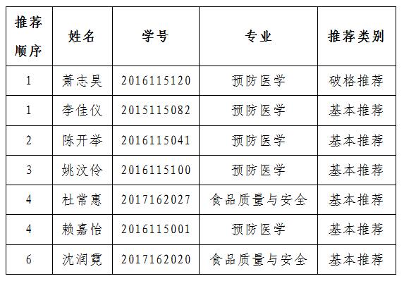根据《银河 推荐优秀应届本科毕业生免试攻读硕士学位研究生工作实施办法》(广医大发〔2018〕65号),按照银河 《推荐2021届优秀应届本科毕业生免试攻读硕士学位研究生遴选工作实施方案》,银河 分配给银河 6个基本推荐名额。本次银河 共计收到9份申请,其中申请基本推荐8人(预防医学专业6人,食品质量与安全专业2人),申请破格推荐1人(预防医学专业1人)。经银河 推免工作小组评审遴选,按银河 相关文件要求和分数高低,评选出前6名基本推荐,1名破格推荐共7名作为银河 推荐人选,参加银河 推免候选人评审。现对银河 拟推荐候选人进行公示。