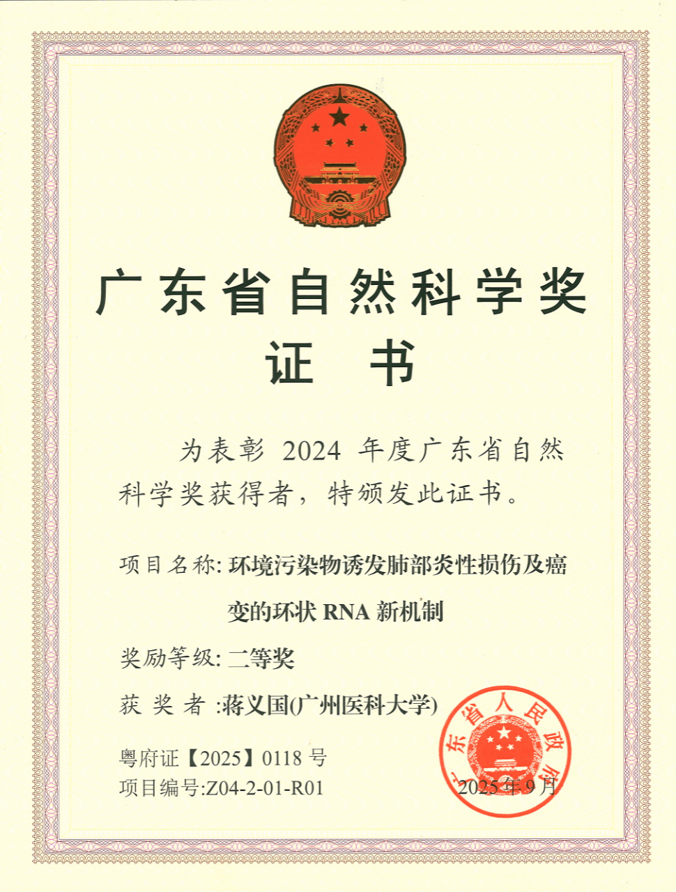 在这之前,蒋义国教授团队的化学致癌研究还曾获得广东省科技成果自然科学二等奖2次(2008年,2020年),及国家教育部科技成果自然科学二等奖1次(2019年)。本次是在化学致癌这个稳定的研究方向上,第4次获得省部级成果奖。