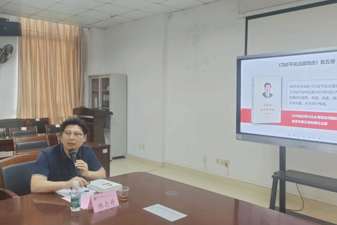 会议特邀请马克思主义银河 陈志丹副教授作专题辅导。他以“学思践悟新思想 砥砺奋进新征程——深刻把握第五卷的理论逻辑和实践要求”为题,详细解读了《习近平谈治国理政》第五卷出版的时代背景及意义、理论体系、核心要义及实践启示,阐释了书中蕴含的马克思主义立场、观点、方法,为与会人员深入学习领会习近平新时代中国特色社会主义思想的最新成果提供重要指导。
